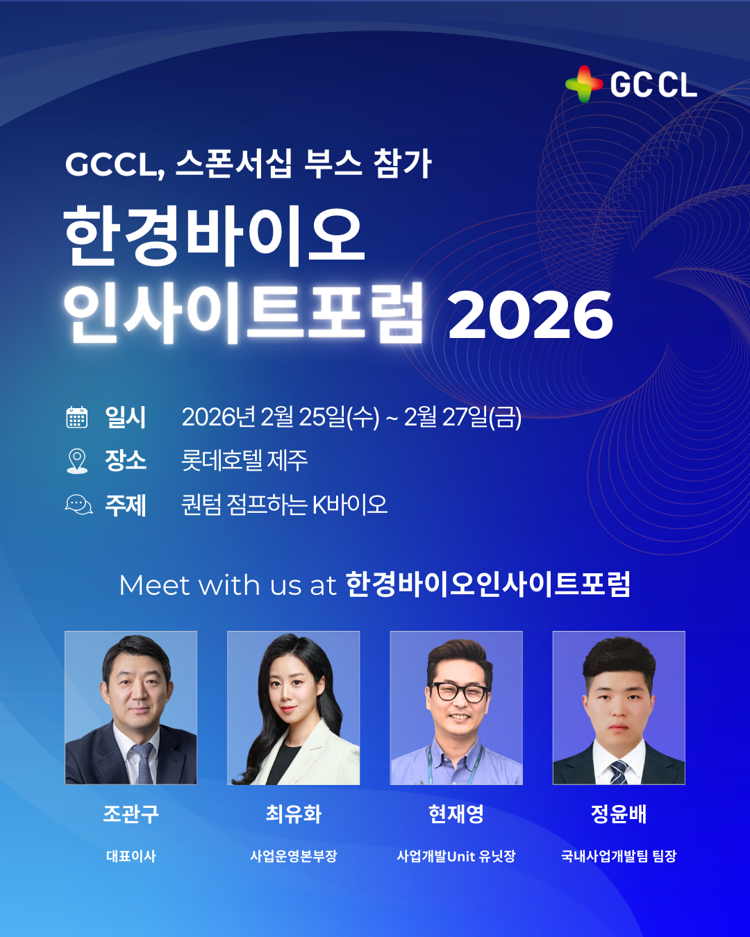 GCCL은 2026년 2월 25일(수)부터 27일(금)까지 롯데호텔 제주에서 개최되는한경바이오 인사이트포럼 2026에스폰서십 부스로 참가합니다.
